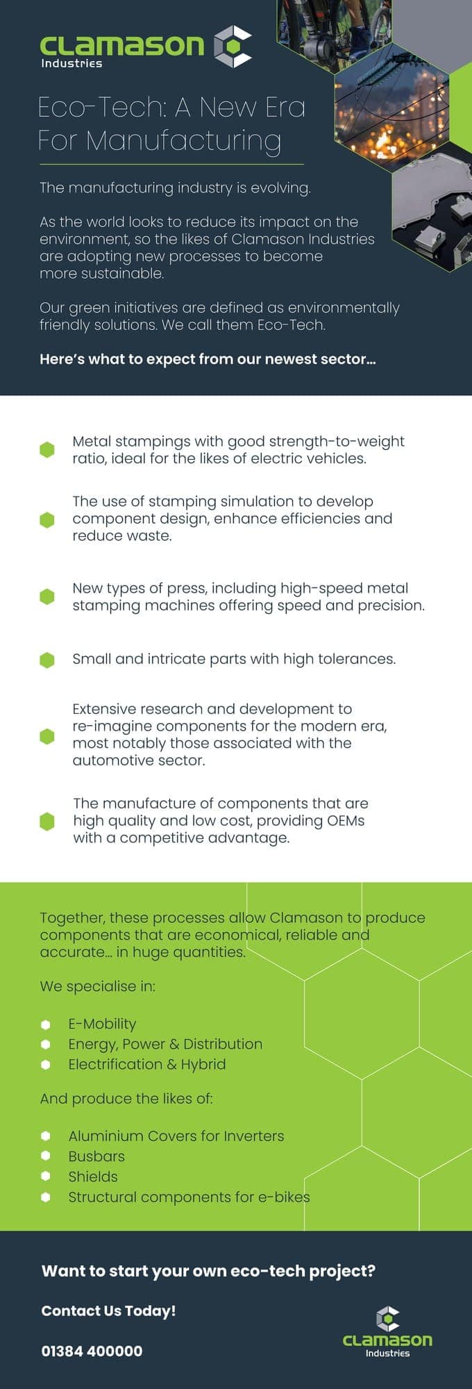Zároveň si však viac ako kedykoľvek predtým uvedomujeme, že udržateľná výroba kategoricky zohráva kľúčovú úlohu pri znižovaní mnohých kľúčových deštruktívnych vplyvov na životné prostredie, ako je znečistenie, strata biotopov a vyčerpávanie fosílnych zdrojov. Spoločnosť Clamason je preto hrdá na to, že plne investuje - a od roku 2019 smeruje väčšinu svojho manažmentu a investícií - do podpory našich zákazníkov, ktorí revolučne rozvíjajú ekologické technologické riešenia v celom rade odvetví vrátane: e-mobility, energetiky, energetiky a distribúcie a elektrických a hybridných vozidiel